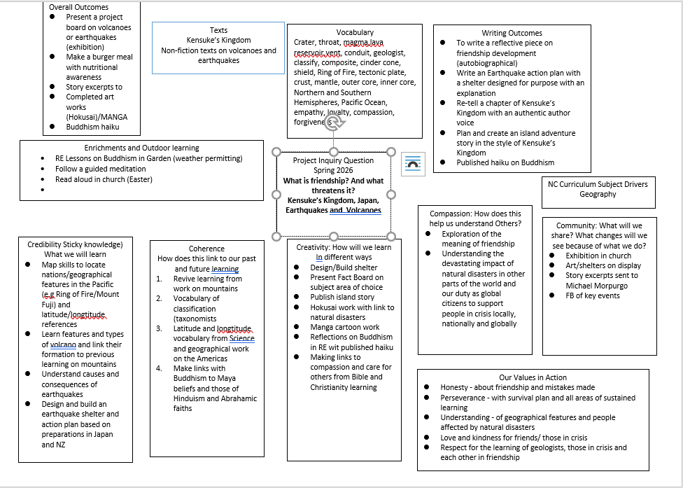 This term we will be having a strong geography focus developing our understanding of the physical and environmental impacts of earthquakes and volcanoes - as well as their relationship to human communities. We will be engaging in philosophical reflection on the nature of friendship through our study of Michael Morpurgo's 'Kensuke's Kingdom'.