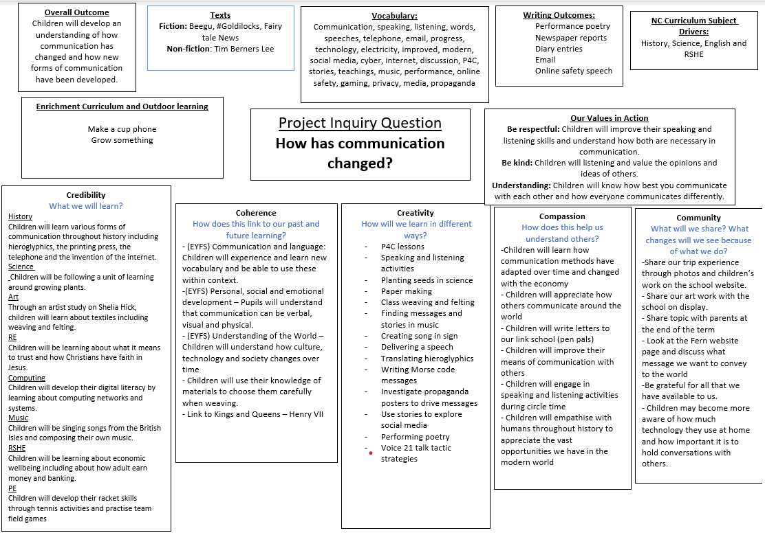 Welcome to the Fern class page! We are having a great year so far with lots of learning and laughter. Our project this term is 'How has communication changed over time?' Please see our long-term plan below to understand more about what we have planned.